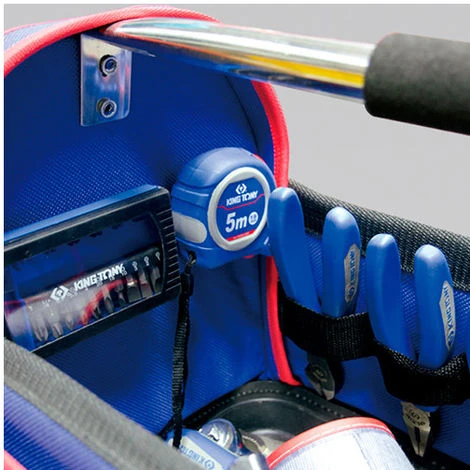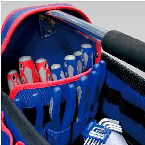 Poignée Confort. Corps de la poignée en aluminium fixé par 4 points de rivet. Grande soute avec rangements élastiques et emplacements pour tournevis. Rangements extérieurs avec emplacement pour scie. Résistance du tissus 1200×1200 deniers. 50% plus légère qu’une caisse métallique. Équipée de 39 emplacements de rangements. Assemblage renforcé par rivets. Protection supérieure repliable dans sa poche. Fond rigide et imperméable moulé en PP. Anse de sac avec protection sur l’épaule Fixation métallique. Livrée sans outils.